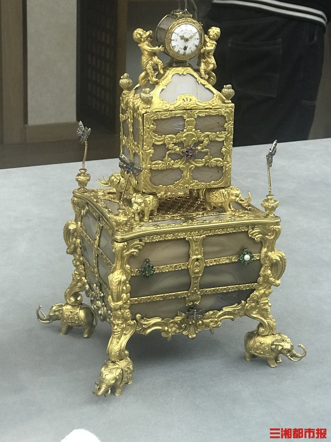方昭远介绍,此琴钟镶有珠宝,镀有金边,其尖顶精心设计为孔雀式,金字塔形盖上方是由两个天使支撑的圆形钟表。上部的盒子由八块玛瑙面板组成,被金质框架包裹,并由四头大象支撑,盒内装有镊子、耳勺、牙签、剪刀等物件。下部盒子与上部形制相似,四角装饰有镶嵌宝石的蝴蝶。该琴钟制作者詹姆士·考克斯(约1723-1800)是十八世纪英国著名钟表、珠宝制造商。1760年后,他开始制造机械钟表,并擅长用金银、珠宝进行华丽装饰。考克斯的作品大量出口到中国及其它远东地区,其工艺风格备受清廷皇室欢迎,北京故宫今天仍收藏有他的作品。