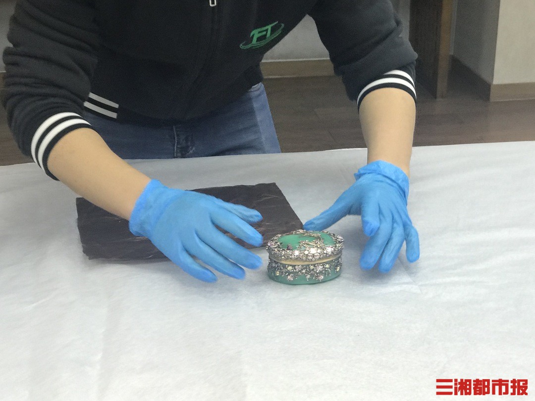 工作人员从包装纸中轻轻取出“绿玉髓镶钻鼻烟盒”时,人们才看清鼻烟盒中有成年人的手掌大小。不过不要小看它个头小小,它可是本次展览的压轴文物,它的图片被放在了本次展览的海报中。