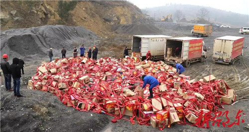 1月20日,中方县泸阳镇对私自流动经营售卖烟花爆竹现象进行整治,执法人员在泸西村现场查扣并销毁烟花爆竹43箱。