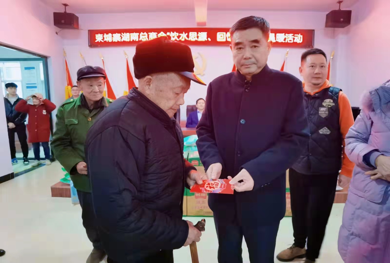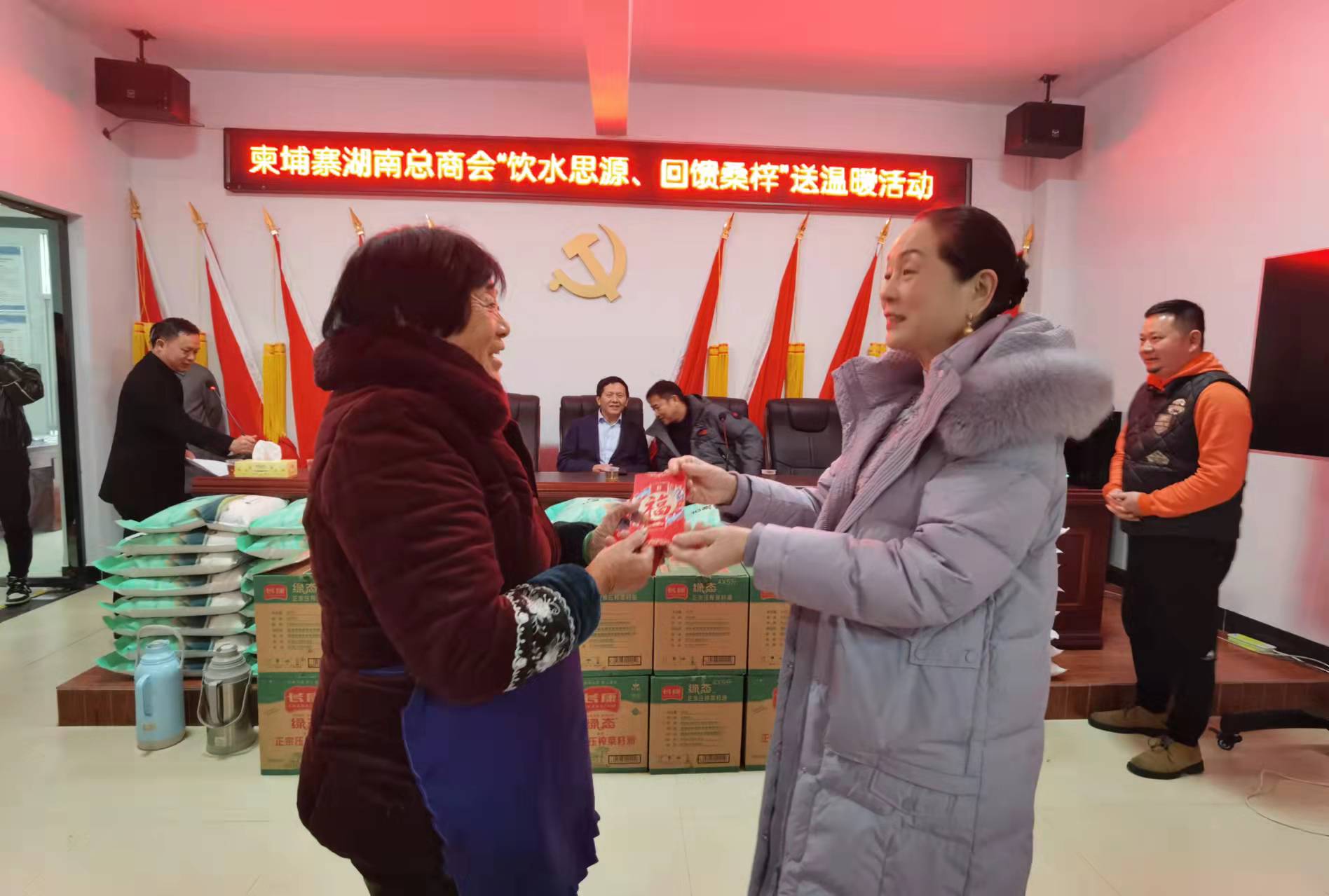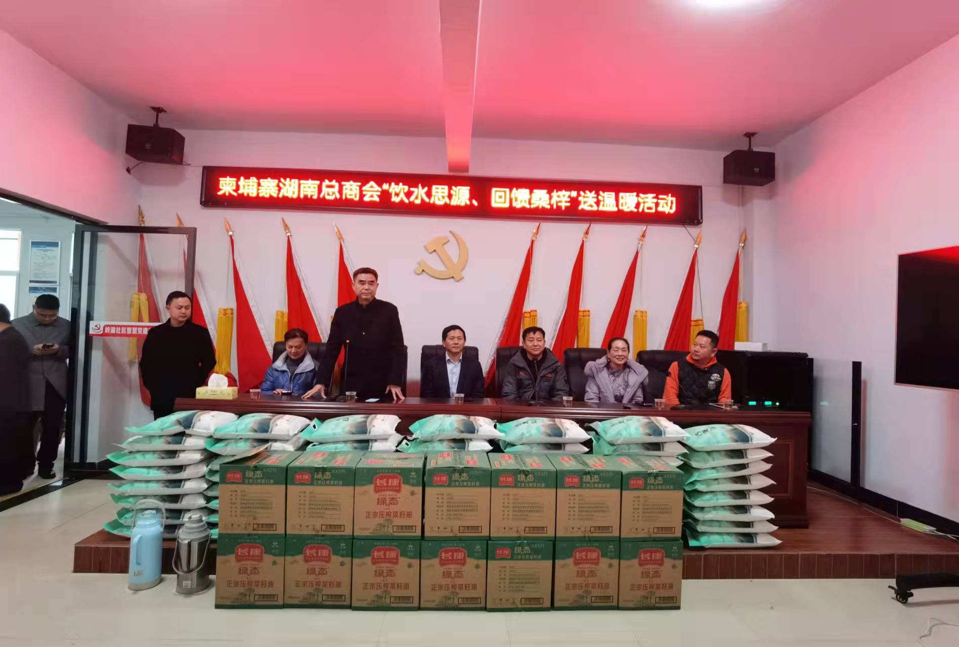 新湖南客户端1月5日讯(通讯员 张毕斋)1月4日,湖南异地商会联合会常务副会长单位、柬埔寨湖南总商会分别在常德市汉寿县沧浪街道岭湖社区、岩汪湖镇木子树村开展了“饮水思源 回馈桑梓”送温暖活动。柬埔寨湖南总商会驻湖南办事处主任、湖南异地商会联合会副秘书长高德才,湖南异地商会联合会驻美国联络办主任李佩明,柬埔寨湖南总商会副会长杨南科,常德市侨联主席郭震宇,原主席陈立君,汉寿县委常委、统战部部长何斌,汉寿县侨联主席胡金等出席活动。