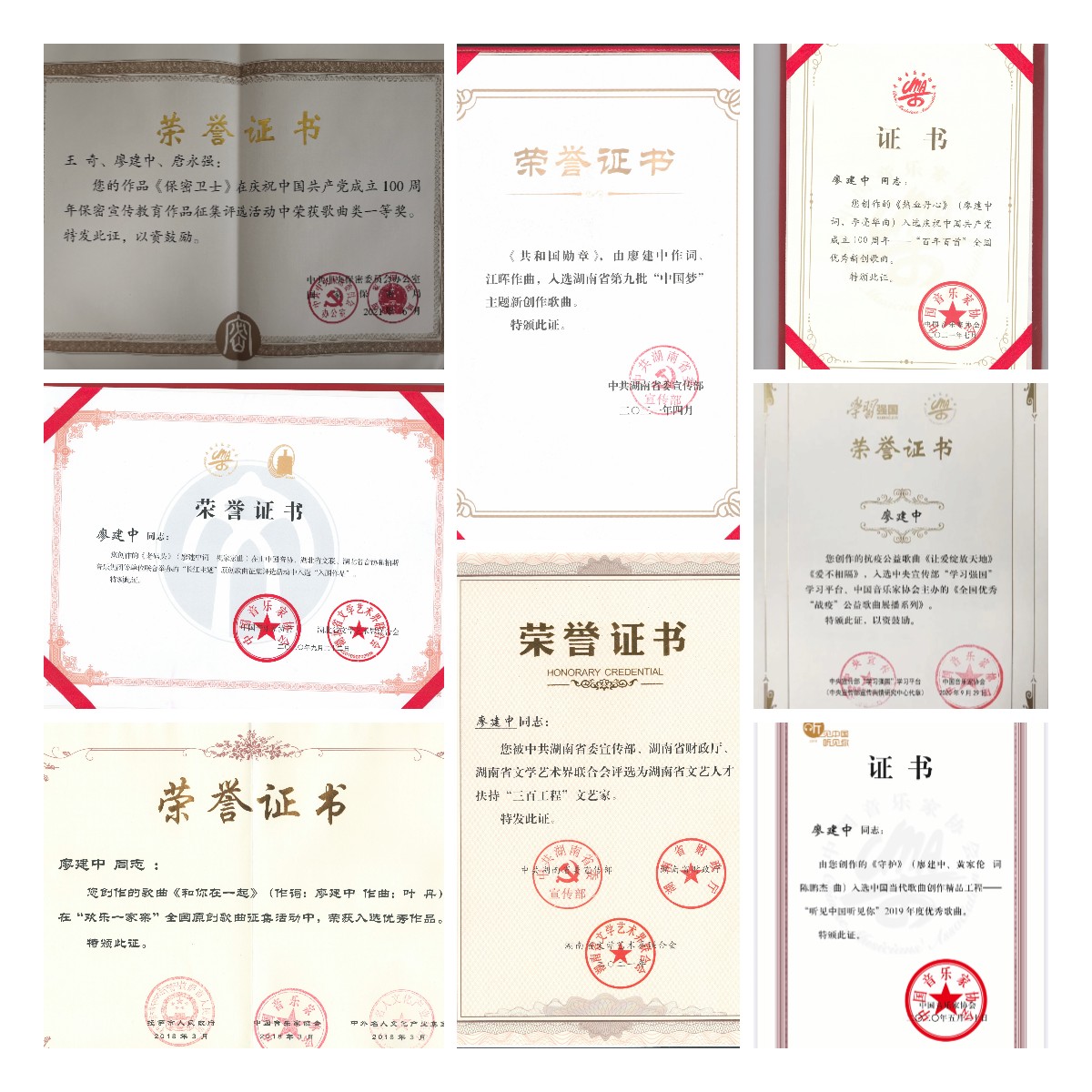 《让爱绽放天地》《爱不相隔》被中宣部宣传舆情研究中心、中国音协、学习强国评为全国优秀“战疫”公益歌曲,《永在》《山河记得》入选由中国文联、共青团中央、中国音协主办的“心中的歌”——庆祝中国共产党成立100周年歌词征集活动,《热血丹心》(汤子星演唱)入选中国音协庆祝中国共产党成立100周年“百年百首”全国优秀原创歌曲,《保密卫士》获中共中央保密委员会、国家保密局主办的保密宣传教育作品征集歌曲一等奖,《冰雪速度》入围2022年北京冬奥会会歌,并在2021年央视端午晚会(平安、吉娜、娄艺潇、郑艺彬等演唱)及北京2022年冬奥会和冬残奥会主题口号发布仪式(蔡程昱、金圣权、马佳等演唱)上演。《和你在一起》入选中国音协“欢乐一家亲”歌曲征集活动,《开满星光的树》入围中国音协“金色的田野” ——纪念改革开放四十周年原创歌曲推选活动,《老码头》入围中国音协“长江主题”歌曲征评活动,《故乡》获中国音乐文学学会第十一届全国青年歌词创作大赛优秀奖,《红船驶进新时代》获中国合唱协会第二届“红船颂·南湖情”原创歌词大赛一等奖,《红色摇篮唱辉煌》获第四届湖南省曲艺大赛一等奖,《故乡》获湖南省第六届艺术节金奖,《共和国勋章》入选湖南省第九批“中国梦”主题新创作歌曲。