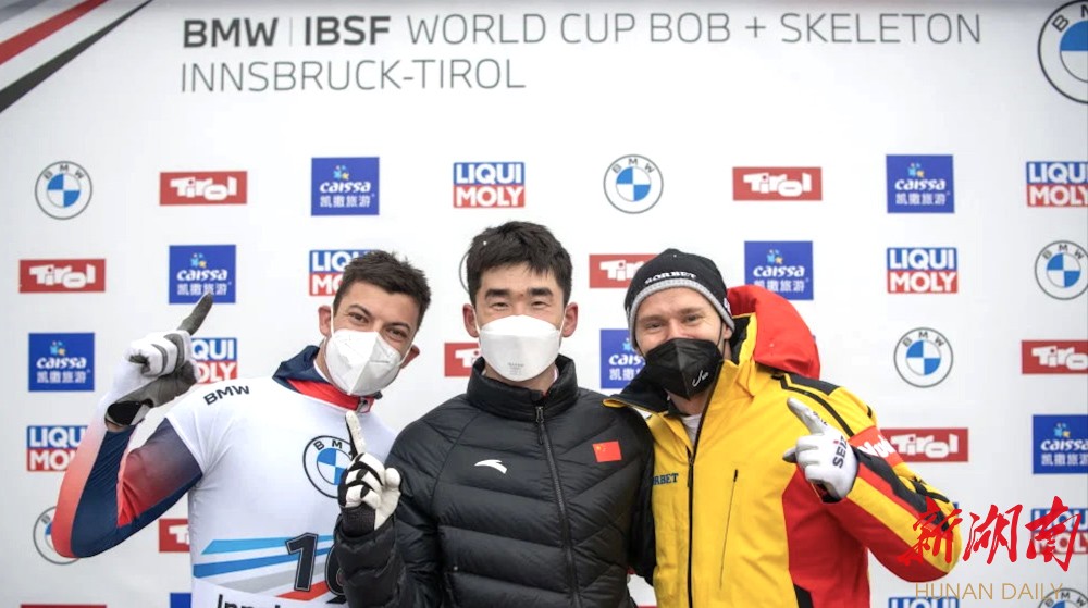 ▲2021年11月26日,中国选手耿文强在钢架雪车世界杯奥地利因斯布鲁克站男子单人比赛中,以1分46秒04的成绩,与英国选手维斯顿、德国选手格罗瑟尔并列获得冠军。