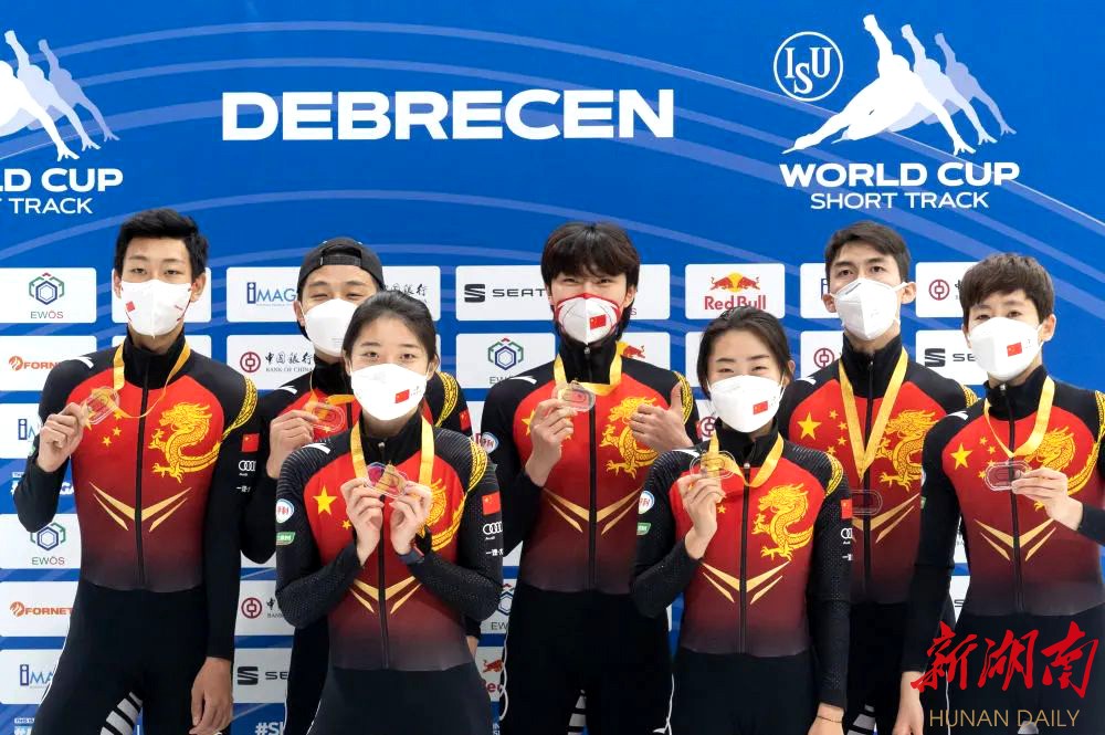 ▲ 2021年11月21日,中国队在短道速滑世界杯匈牙利站混合接力2000米颁奖仪式上。他们以2分39秒386的成绩获得冠军。