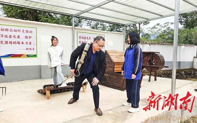 ▲校长刘良伟为学生讲解和演示传统农具操作