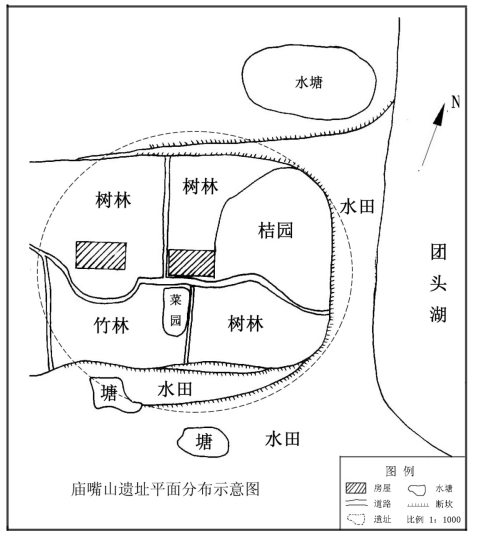 庙嘴山遗址为新石器时代遗址,位于凌冲村长塘组。遗址地处团头湖西南岸的一处台地上,面积约5000平米,台地高出周围地表约30-60厘米,文化层厚约30厘米,距地表深度不一,最浅处距现地表仅10厘米。包含物主要为红烧土颗粒及陶器残片。陶片以红陶为主,兼有红褐陶及少量灰陶,泥质、夹砂均有,可辨器型包括鼎、豆、罐、盆等。