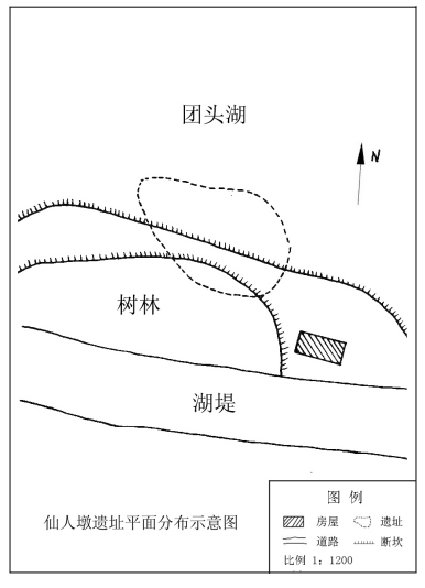 仙人墩遗址是一处新石器时代遗址,保护面积2292平方米,位于凌冲村高塘组。遗址位于团头湖西南岸一处临湖台地上,地表中部高四周低,略呈龟背形,在临湖一侧断面上可见文化堆积,厚20—30厘米,内夹少量陶器残片和红烧土颗粒、碳粒,陶片主要有黑陶片、鼎足等。该遗址东南距螺坨晒衣遗址约150米