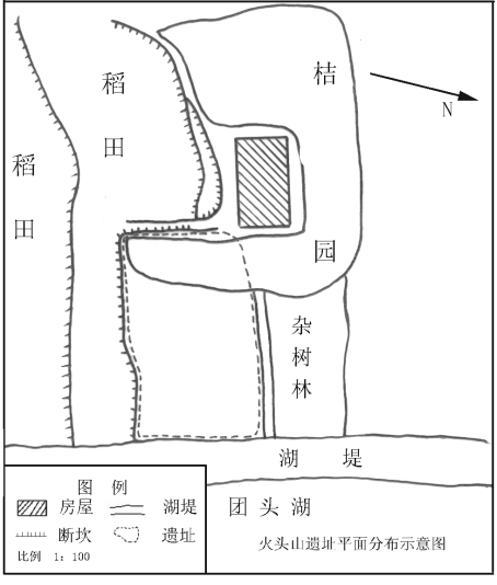 火头山遗址位是新石器时代晚期遗址,位于凌冲村长塘组。遗址地处团头湖南岸的临湖台地上,略呈长方形,东西长约30米,南北宽约24米,总面积约660平方米。遗址南侧的断面可见文化堆积层,厚约50厘米,标本均为泥质红陶,陶器器形不辨。