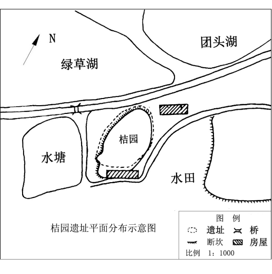桔园遗址是一处新石器时代遗址,位于凌冲村东塘组。地处绿草湖南岸的一高出周围地面约1.5米的台地上,平面形状略呈椭园形,保护面积1000平方米,在台地西北侧断崖上可见文化层,厚约30—40厘米。包含物主要为陶片、红烧土颗粒和碳屑颗粒,采集有少量残陶纺轮及陶片,以夹砂陶为主,多红陶和红褐陶。