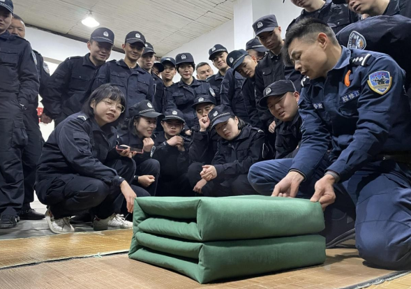 “出门看队伍,进门看内务”,内务是一支队伍精神风貌的直接体现。警训第一堂课就是“如何叠好第一床被子”,如何叠成“豆腐块”也是初入校新警的“心头坎”。为提升质量,切实提升内务标准,磨练学员心性,程修江教官教授新警按照“平、折、压、抠、卡、齐、直、正”的折叠要领和步骤“制作”出一床“豆腐块”。