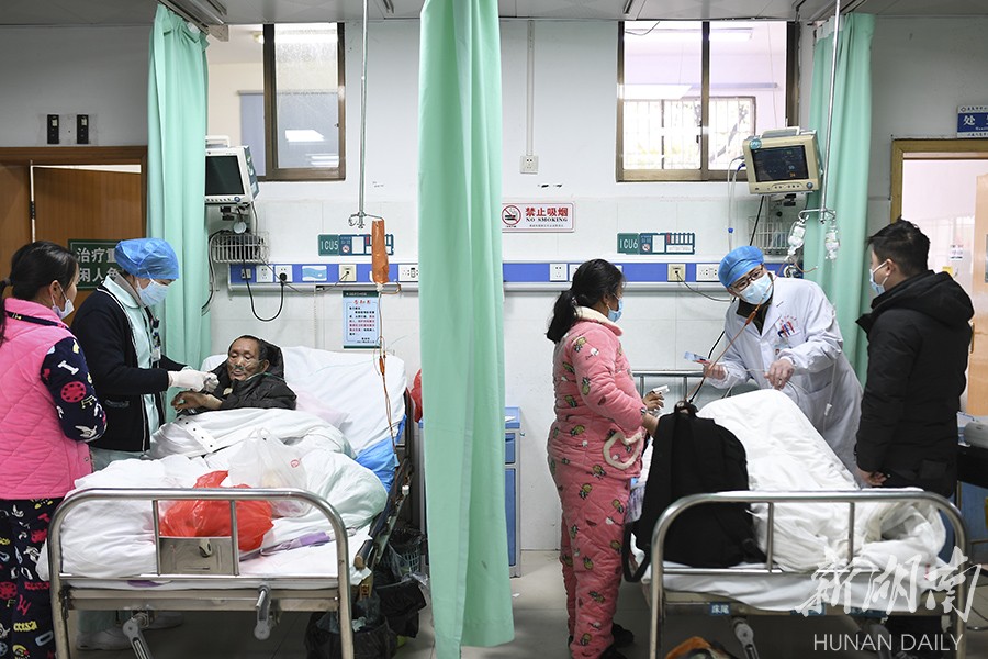 1月31日,娄底市中心医院急诊内科医护人员在护理病人。