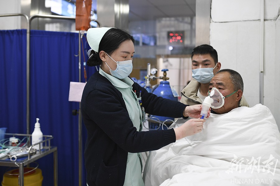 1月31日,娄底市中心医院急诊内科护士为病人安装雾化设备。