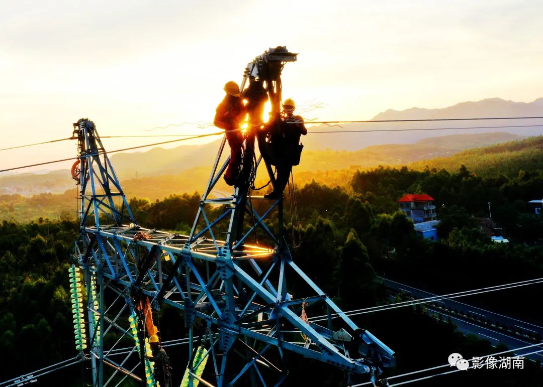 ▲2021年9月5日,嘉禾县晋屏镇甫口村,电力工人在(蓝山塔峰——嘉禾马托)220千伏线路铁塔上架线作业。