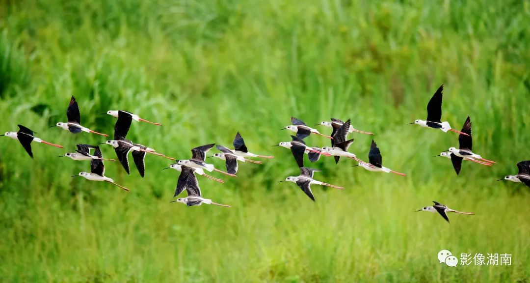 ▲2021年8月17日,嘉禾县晋屏镇甫口村河畔,数十只黑翅长脚鹬在天空翻飞。