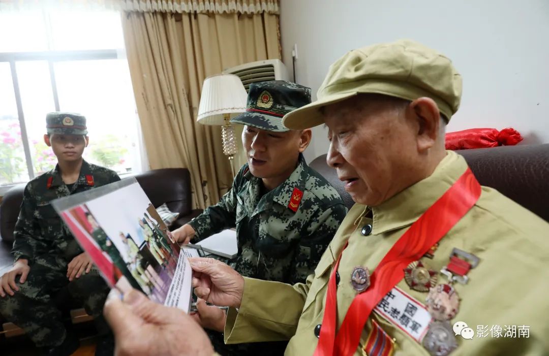 ▲2021年10月12日,资兴市抗美援朝老兵张益思正在向武警官兵讲述战斗故事。
