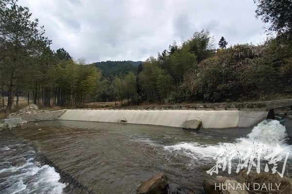 大塘镇全溪村拦河大坝已完工,清澈的河水源源流入田间,大片农田被滋润着,村民憧憬着来年丰收。