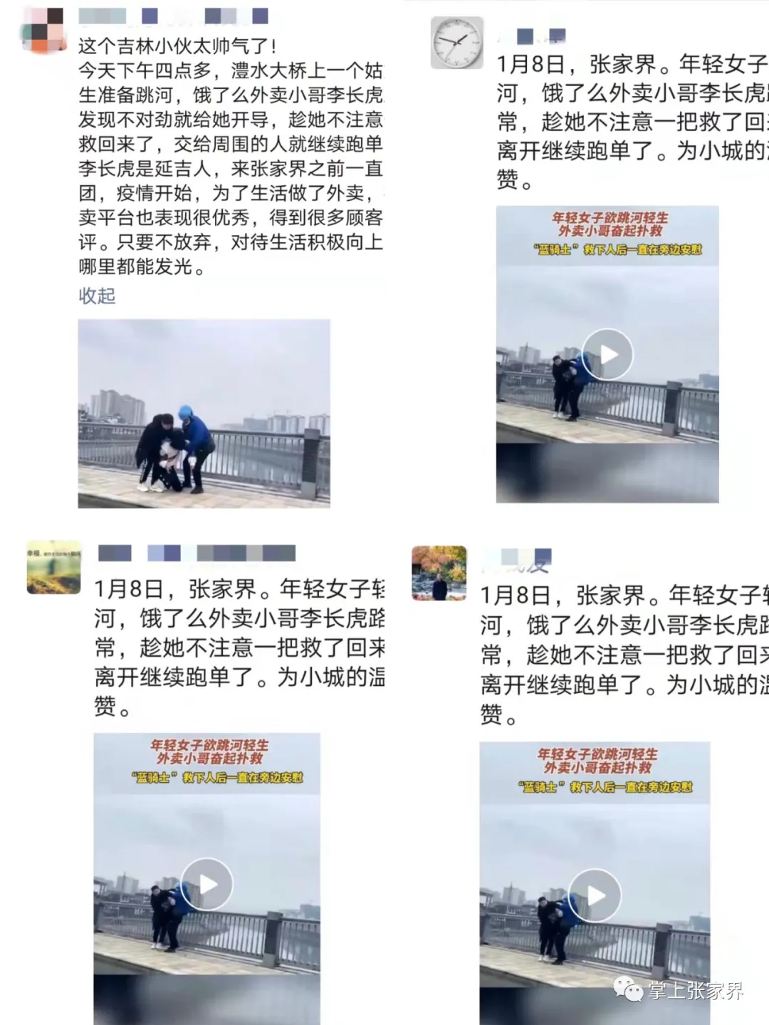 1月8日一条张家界的外卖小哥勇救轻生女孩的视频在朋友圈里传播开来