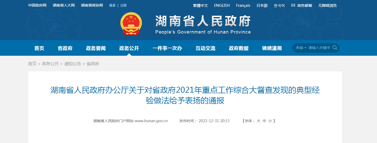 近日,省人民政府办公厅发布《关于对省政府2021年重点工作综合大督查发现的典型经验做法给予表扬的通报》,其中,大祥区这项典型经验做法获得通报表扬。