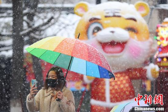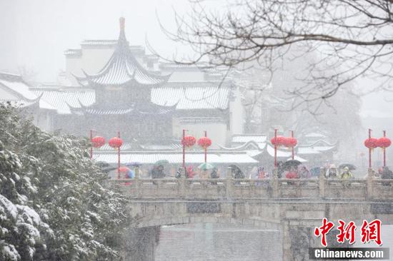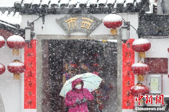 2月7日,南京城迎来漫天大雪,雪花纷纷扬扬。据中央气象台发布的暴雪预警信息预计,安徽东南部、江苏西南部、浙江西北部等地部分地区有大雪。图为市民在雪中参观南京夫子庙。 泱波 摄