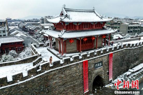 2月7日,湖北省襄阳市,襄阳古城迎来降雪。雪后的襄阳古城,银装素裹,景色如画。图为襄阳古城仲宣楼段雪景。(无人机照片) 中新社发 杨东 摄