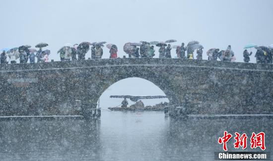 2月7日,众多游人撑伞在西湖断桥上赏雪。当日,浙江杭州出现降雪天气,雪中的西湖美景吸引游人。 中新社记者 王刚 摄