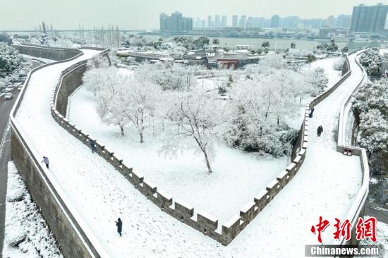 2月7日,湖北省襄阳市,襄阳古城迎来降雪。雪后的襄阳古城,银装素裹,景色如画。图为游人在襄阳古城临汉门段城墙上赏雪。(无人机照片) 中新社发 杨东 摄