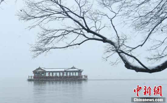 2月7日,雪中西湖上的一艘游船。当日,浙江杭州出现降雪天气,雪中的西湖美景吸引游人。 中新社记者 王刚 摄