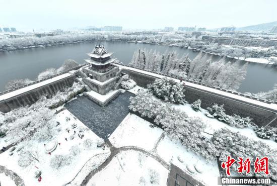 2月7日,湖北省襄阳市,襄阳古城迎来降雪。雪后的襄阳古城,银装素裹,景色如画。图为襄阳古城雪景。(无人机照片) 中新社发 杨东 摄