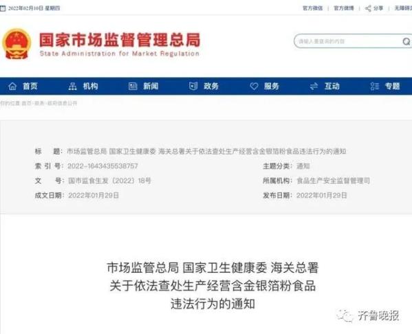 《通知》要求,严格网络交易监管,加强平台内经营者资质审核,严禁平台内经营者销售含金银箔粉食品。加强对“含金银箔粉食品”“可食用金银箔粉”的网络交易监测,及时督促网络交易平台依法采取下架等处置措施。