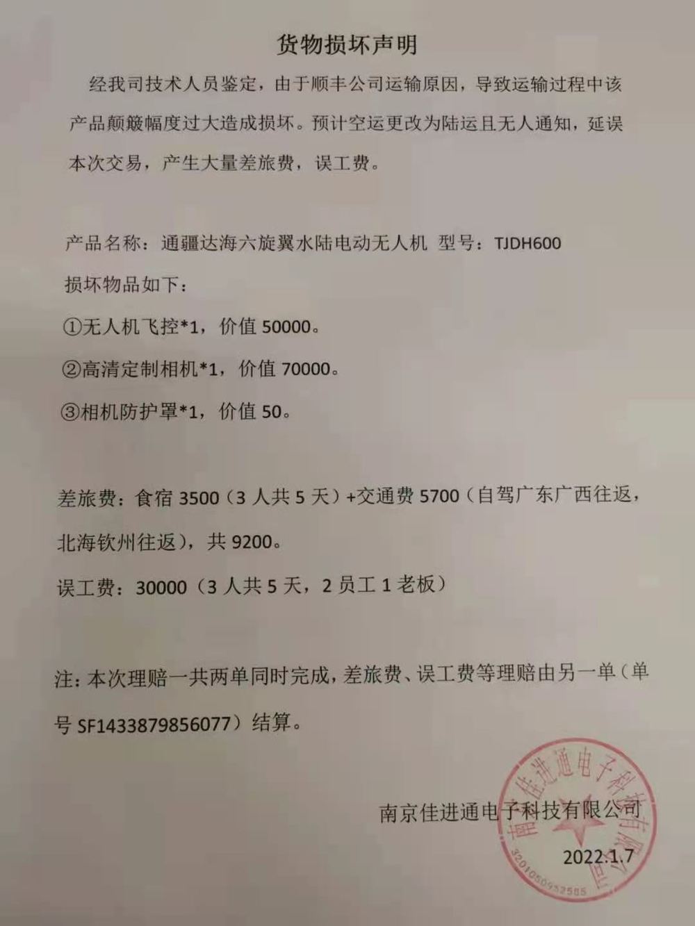 张先生公司出示的货物损坏声明称,由于顺丰运输原因,运输过程中产品颠簸幅度过大造成损坏,空运更改为陆运无人通知,延误本次交易。两架无人机损坏的飞控,共价值10万元,两个相机防护罩价值100元,一个高清定制相机价值7万元。此外,加上差旅费、交通费及误工费,向顺丰共索赔20.93万元。