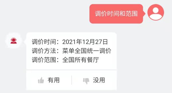 肯德基中国在线客服对调价的回复