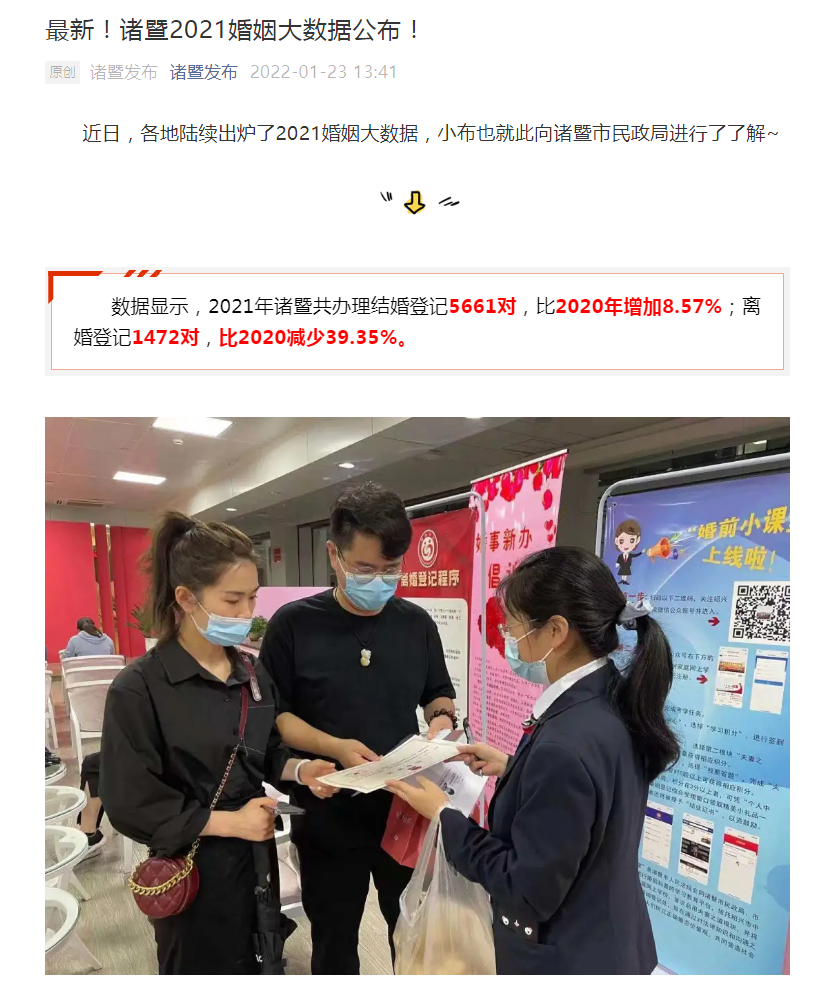值得一提的是,浙江绍兴、山东滨州、浙江诸暨等地离婚登记量较2020年减少了三成以上,安徽合肥、阜阳等地更是减少了近一半。