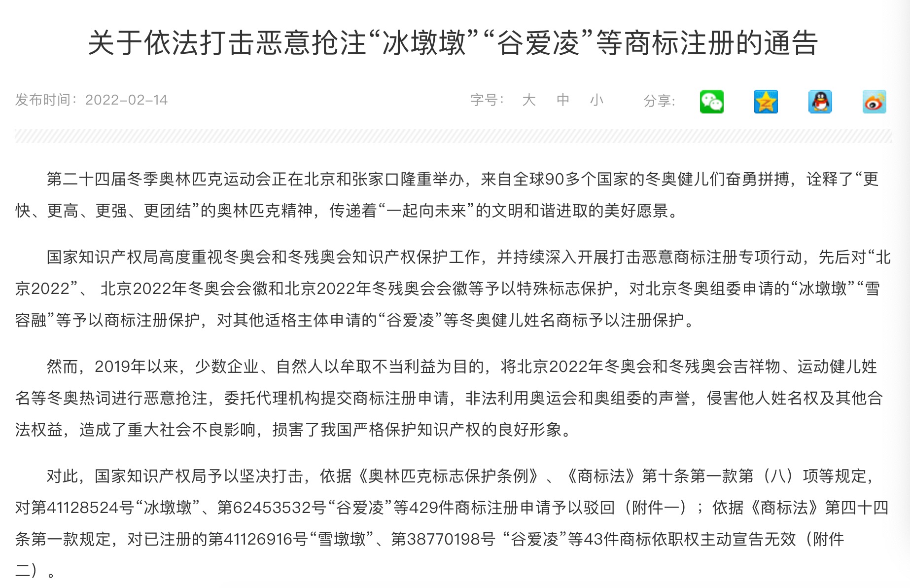 通告称,2019年以来,少数企业、自然人以牟取不当利益为目的,将北京2022年冬奥会和冬残奥会吉祥物、运动健儿姓名等冬奥热词进行恶意抢注,国家知识产权局予以坚决打击,依据《奥林匹克标志保护条例》《商标法》第十条第一款第(八)项等规定,对第41128524号“冰墩墩”、第62453532号“谷爱凌”等429件商标注册申请予以驳回;依据《商标法》第四十四条第一款规定,对已注册的第41126916号“雪墩墩”、第38770198号 “谷爱凌”等43件商标依职权主动宣告无效。
