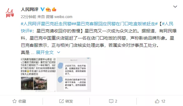 星巴克又一次成为众矢之的。据报道,有网民爆料,星巴克中国重庆店驱赶了一名在店门口吃饭的民警,声称影响品牌形象。星巴克客服表示,正与相关门店核实处理此事,若属实会对涉事员工处分。