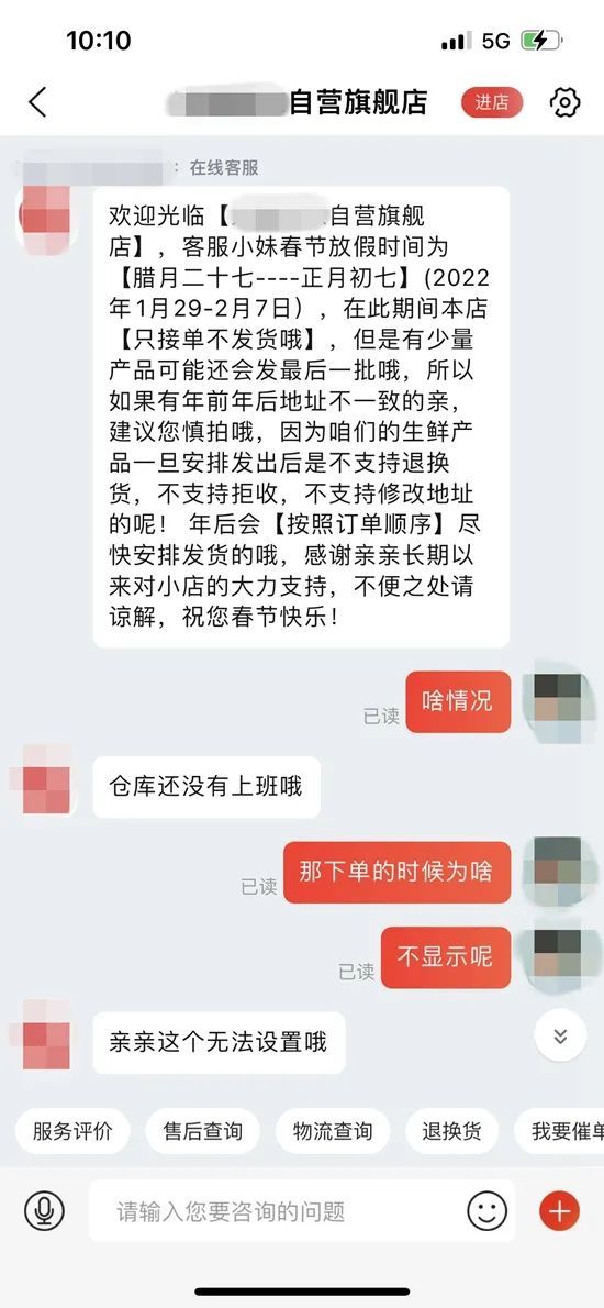 据该消费者向中新财经表示,询问店铺客服后,客服称“仓库还没上班”。