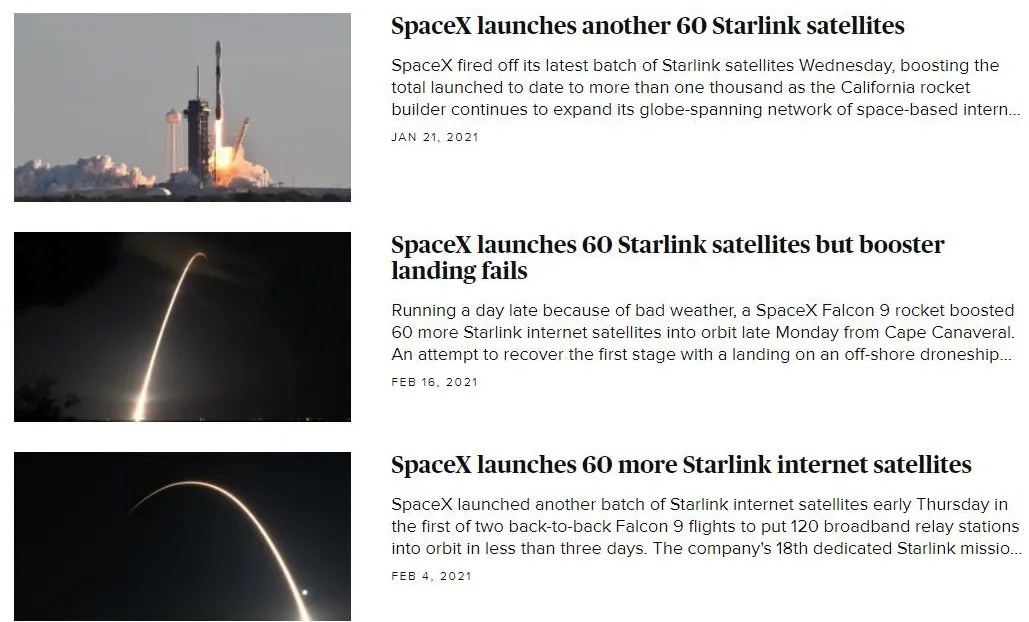 SpaceX公司的“星链”卫星发射频率密集。图片来源:美国哥伦比亚广播公司报道页面截图