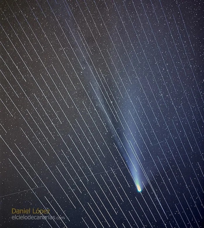 大量星链卫星的移动痕迹,干扰了对新智彗星的观测。图片来源:Daniel Lopéz/