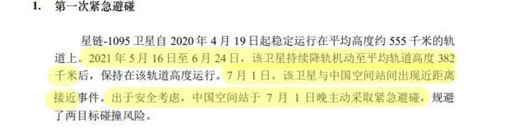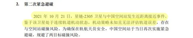 2021年12月,中国常驻联合国(维也纳)代表团向联合国秘书长提交照会表示,美国的星链卫星两次危险接近中国空间站。