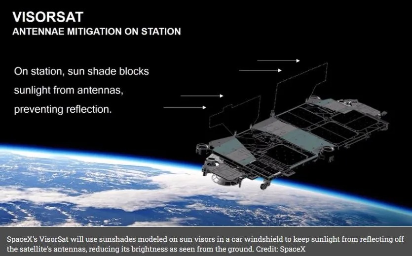 意识到这些问题的马斯克,为新发射的卫星安装了一种叫“Visorsat”的折叠板来降低反光率,但这没有达到美国天文学会等组织的标准,仍不能让人满意,而已发射的卫星也无法安装这些装置。