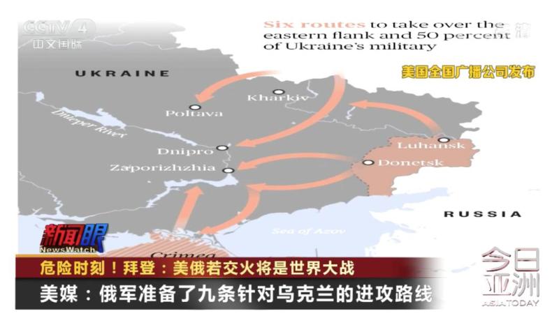 美国全国广播公司NBC10日援引美国军方与情报部门的最新分析报道,俄罗斯已经准备了9条针对乌克兰的进攻路线——其中6条集中在乌克兰东部和南部,另有2条则是在北部方向,主要目标是乌首都基辅。