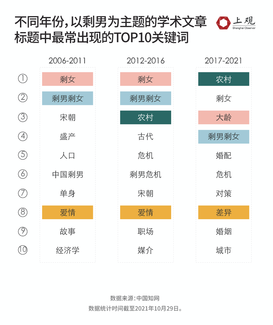 以“剩男”为主题的学术论文及报刊文章从2006年才开始出现,但最开始“剩男”指的更多是与“城市剩女”相对的“城市剩男”。直到最近几年, “农村”在“剩男”主题的期刊文章中成为最主要的关键词,“农村剩男”方成为走入研究视野的社会学问题。