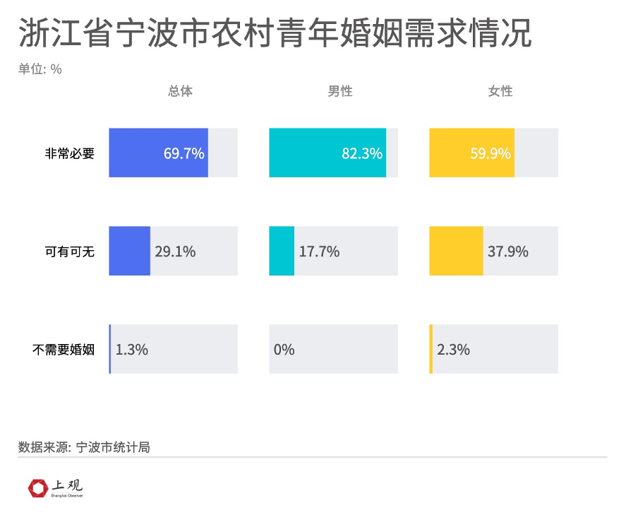 根据宁波市对当地农村青年婚姻问题的调查,当地农村女性更倾向不婚主义。数据显示,82.35%的男性认为婚姻“非常必要”,认为“可有可无”的仅为17.65%,认为“不需要婚姻”的为0;而女性认为婚姻“非常必要”的比例为59.85%,低于男性22.5个百分点,认为“可有可无”的比例为37.88%,更有2.27%的女性认为“不需要婚姻”。