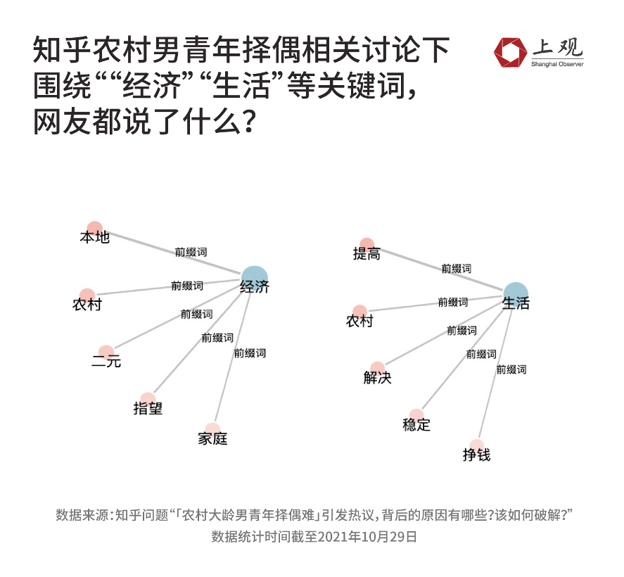许多网友认为,农村男青年的择偶困境本质上仍是发展的问题。当大家提到“生活”,被高频提及的前缀词包括“提高”、“农村”、“解决”、“挣钱”等。提到“经济”,“本地”、“农村”、“二元”等词也是被频繁说到的关键词。
