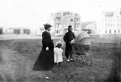 德国军官夫人和女儿与中国佣人推着婴儿车在青岛街头合影(邹德怀收藏)