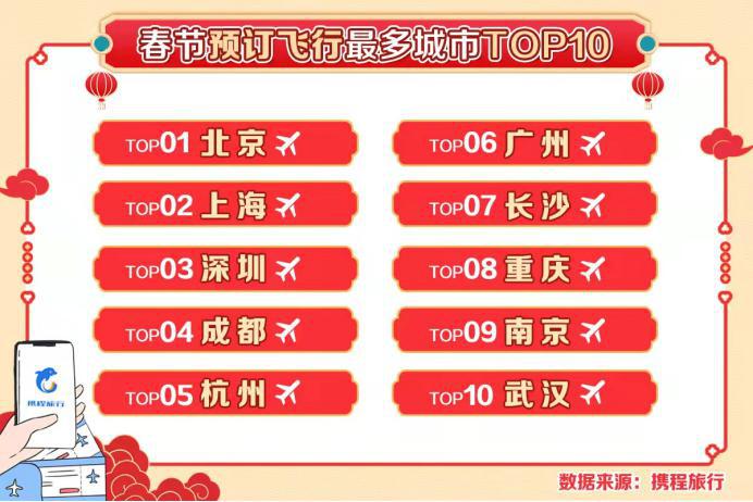哪里人订票最积极?携程平台数据显示,北京、上海、深圳、成都、杭州、广州、长沙、重庆、南京、武汉成为春节预订飞行最多的十大城市。从机票返程数据看,2 月 4 日 -2 月 8 日,热门出发地城市 TOP10 为三亚、北京、海口、上海、成都、重庆、广州、沈阳、哈尔滨、长春。海南与东北成为春节期间 " 一冷一热 " 最受热捧目的地。