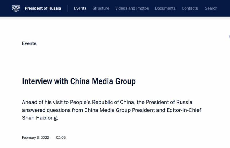 2月3日,俄罗斯总统官网和中国国家通讯社、国家电视台同步发布消息:在受邀出席北京冬奥会开幕式前夕,俄罗斯总统普京接受了中央广播电视总台台长兼总编辑慎海雄的书面专访。