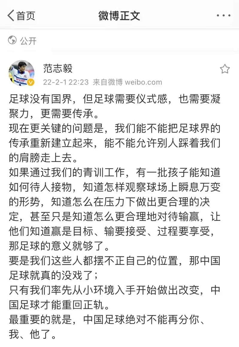 国足输给越南后,范志毅罕见发声:“足球没有国界,但足球需要仪式感,也需要凝聚力,更需要传承。现在更关键的问题是,我们能不能把足球界的传承重新建立起来,能不能允许别人踩着我们的肩膀走上去。要是我们这些人都摆不正自己的位置,那中国足球就真的没戏了;只有我们率先从小环境入手开始做出改变,中国足球才能重回正轨。最重要的就是,中国足球绝对不能再分你、我、他了。”