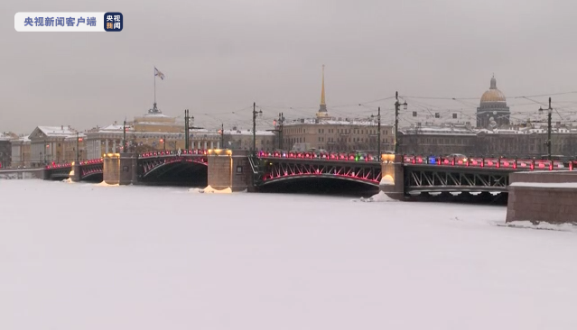 当地时间1月31日17时,俄罗斯圣彼得堡市中心涅瓦河上的地标性建筑冬宫桥以一袭中国红点亮城市的夜色,向即将到来的中国农历虎年春节致贺。