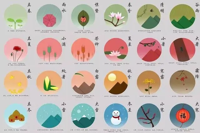 中国古人将太阳周年运动轨迹划分为24等份,每一等份为一个“节气”,统称“二十四节气”,包括:立春、雨水、惊蛰、春分、清明、谷雨、立夏、小满、芒种、夏至、小暑、大暑、立秋、处暑、白露、秋分、寒露、霜降、立冬、小雪、大雪、冬至、小寒、大寒。
