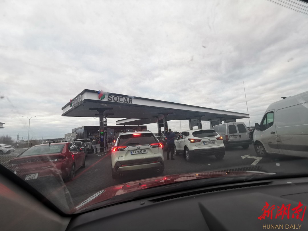 基辅还能看到路两旁残留的白雪,出了基辅就见不到雪了。开了许久,黄蜜要去路边的加油站解决内急。此时,日托米尔州国道边等待加油的车排起了长队。按照加油站规定,每辆车只允许加20升汽油。水和食品也都限购,但超市并没有出现哄抢现象,大家都按规矩有序排队,等待购买。