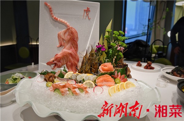 虎年吉祥就是一道兼具视觉美感与新鲜滋味的新式湘菜。菜肴采用食材大拼盘的呈现方式,既有着“团团圆圆”的寓意,又别具匠心地用鲷鱼拼出具有立体感的猛虎造型,期盼着在崭新到来的虎年,人们能像“下山虎”一般虎虎生风。这道菜里,湖南人民喜闻乐见的罗氏虾采用生鲜刺身的方式呈现,鲍鱼等海鲜却又是香辣醇厚的湘卤味道,整体感觉“陌生又熟悉”。